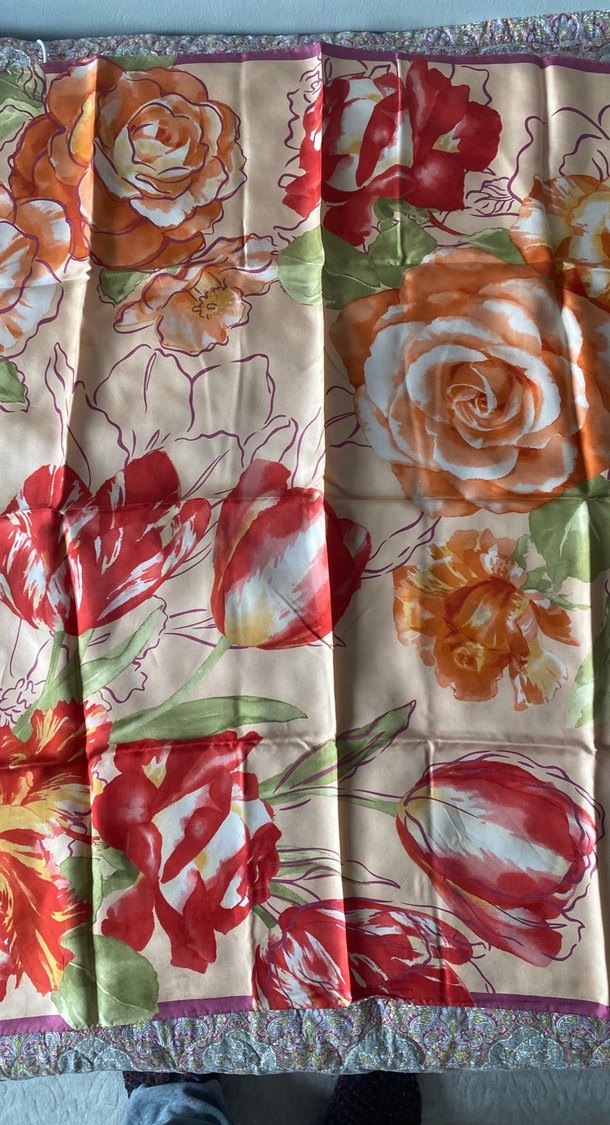 Kadınlar için ipek kumaştan, çok renkli çiçek desenli ve drapeli vintage bohem tarzı eşarp.