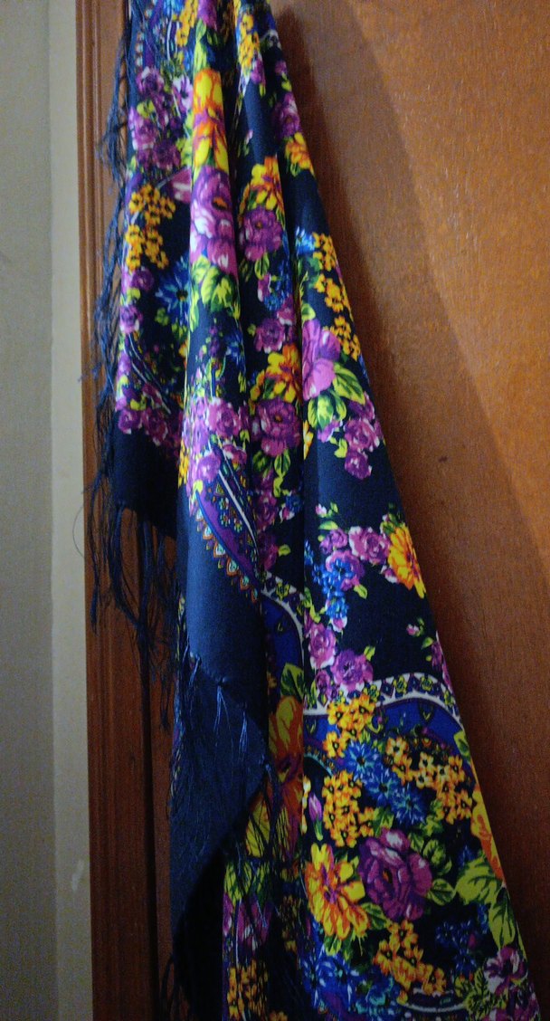 İpekten yapılmış, koyu ve canlı çiçek desenli, bohem tarzda, retro ve hippie havası taşıyan şal. Zarifçe drapelenmiştir. Ütü istemeyen kumaş