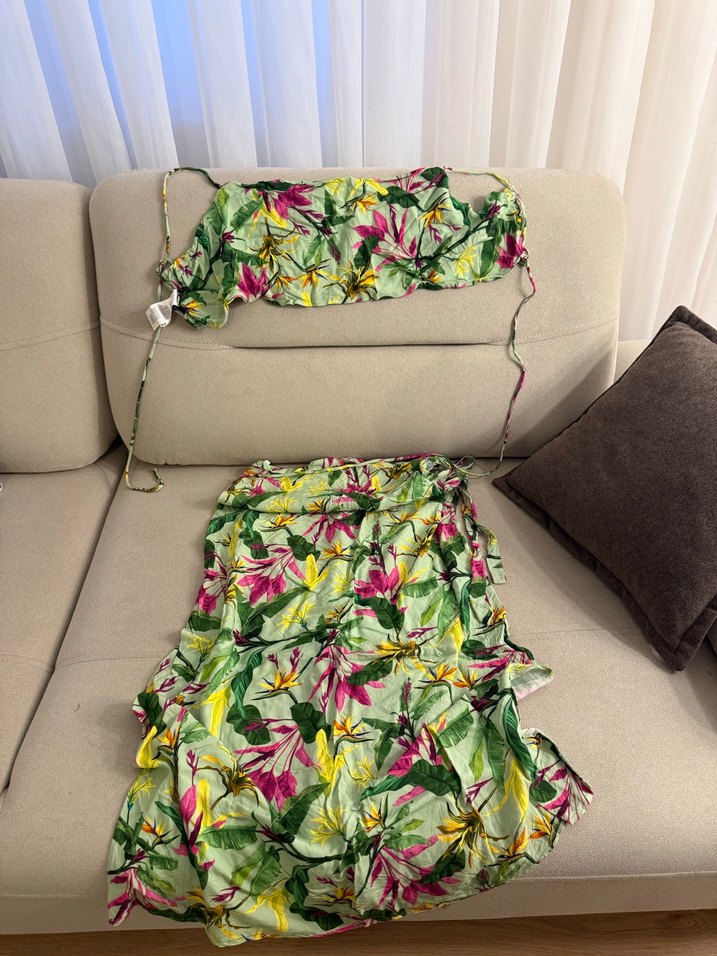 Çiçek desenli, çok renkli ve hafif ipek dokulu bir takım. İnce ayarlanabilir askılı üst ve uyumlu etekten oluşur.