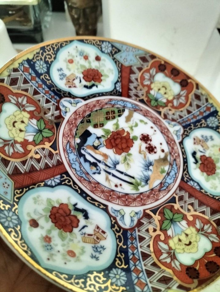 Bu tabak, koyu çok renkli çiçek desenleri ve ince detaylarla altın süslemeler içerir, klasik sofralar için uygundur. 16 cm. ️Orjinal Japon üründür..