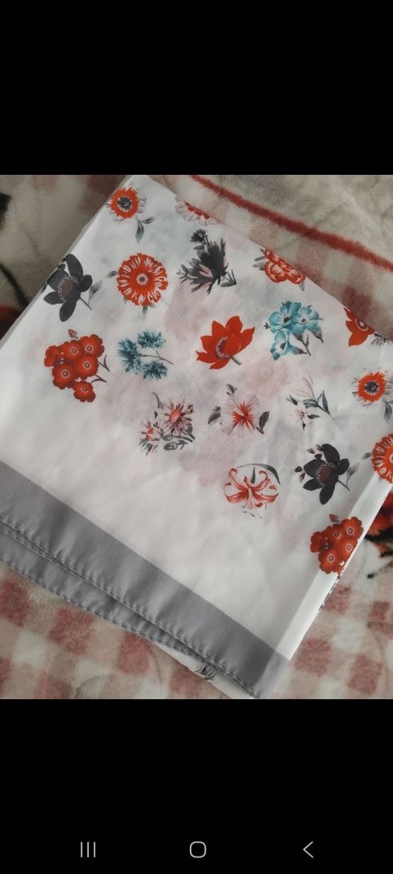Kadın eşarp gri taban üzerinde çok renkli çiçek desenleri ve dökümlü tasarımla, yumuşak sentetik kumaştan üretilmiştir.