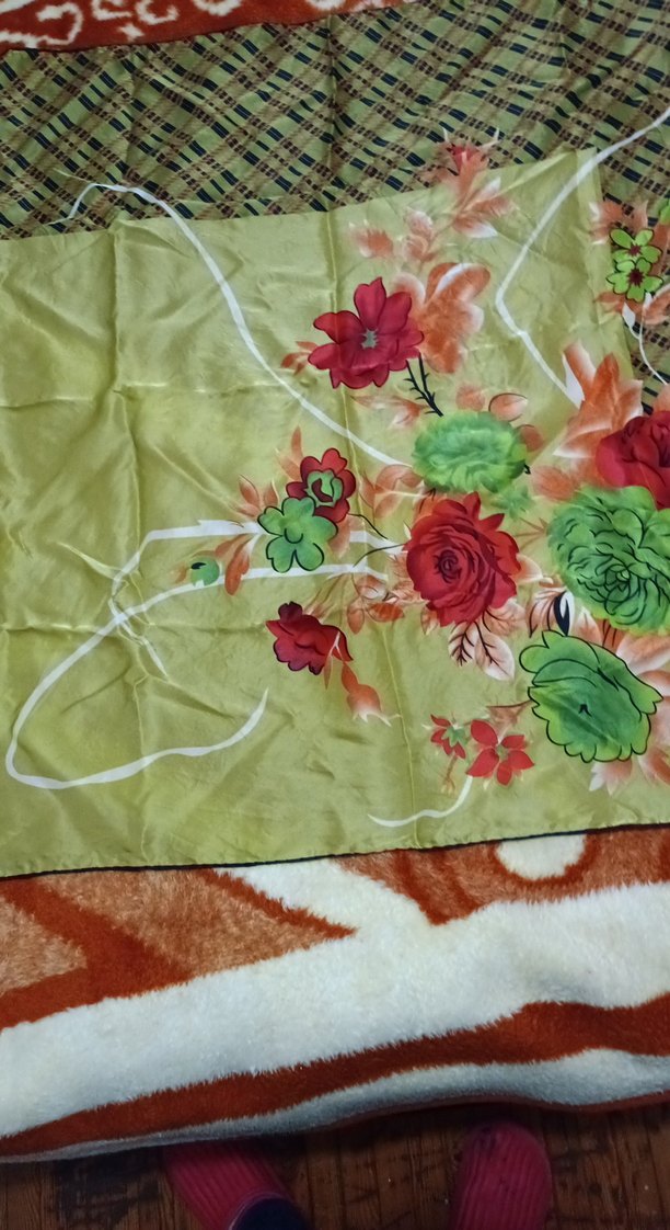 Kadınlar için çok renkli çiçek desenli, hafif sentetik kumaştan yapılmış, drapeli bohem tarzda fular. ugoza marka ipek esrap bikac kere takildi