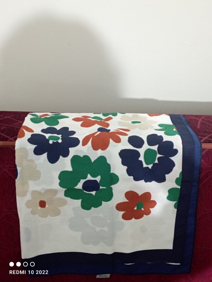 Kadın şal, çok renkli çiçek desenli ve yumuşak tekstil kumaştan, bohem ve retro tarzda, drapeli şekilde tasarlanmıştır.