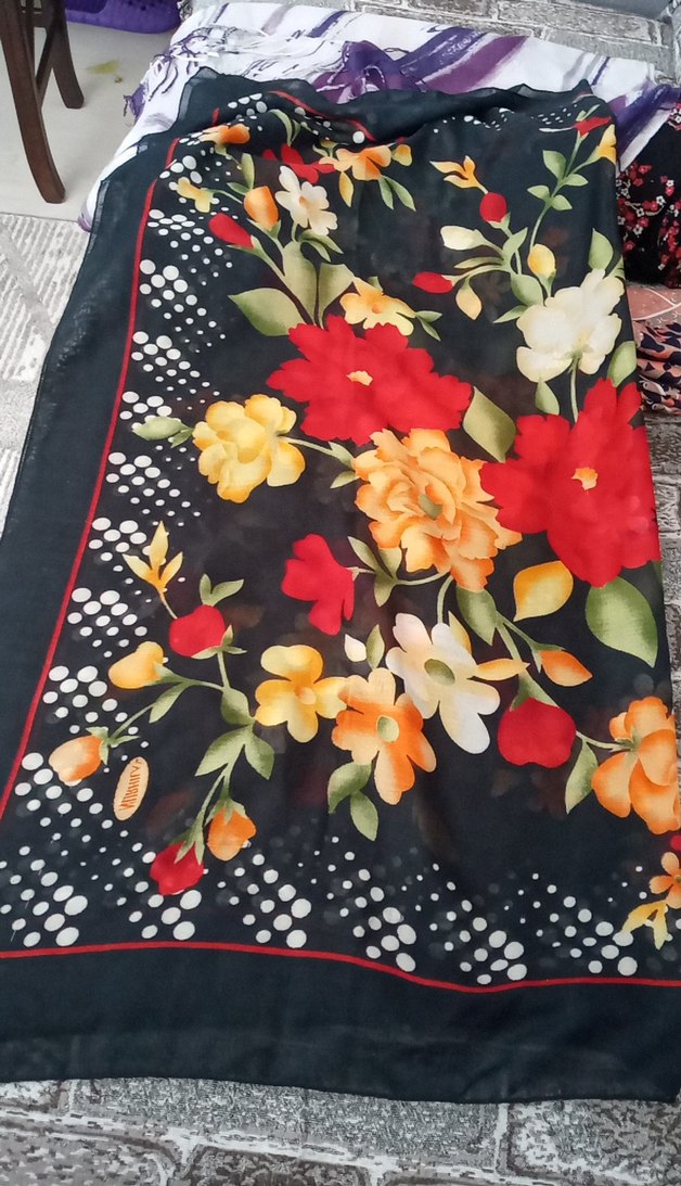 Kadın şalı, koyu zemin üzerine çok renkli çiçek desenleri ve drapeli tasarımıyla bohem ve retro tarzları yansıtıyor.