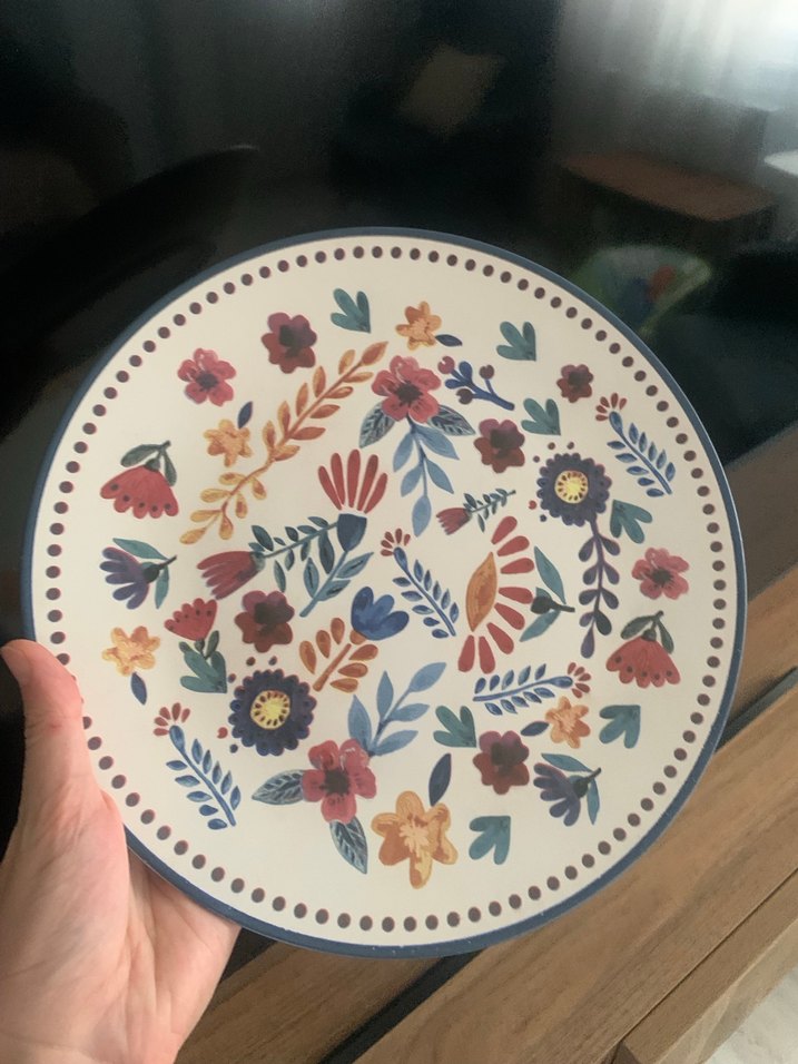 Yuvarlak, çok renkli çiçek desenli servis tabağı. Kenarında noktalı bir bordür bulunur. Yarı kahvaltı takımı. Kare şeklimde pembe görünen renkten çay tabağı da var istenilirse görsel eklerim 6 adet o. İade yoktur her şeyi sorun