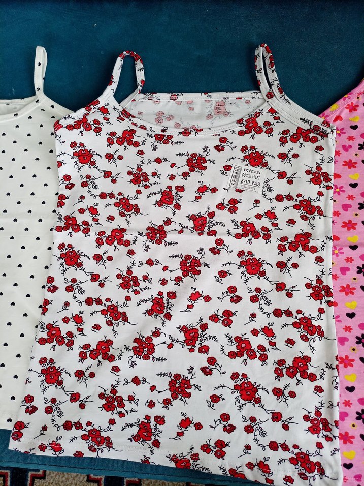Çok renkli, ince askılı kız çocuk atlet, çiçek desenlidir ve yumuşak kumaştan üretilmiştir.