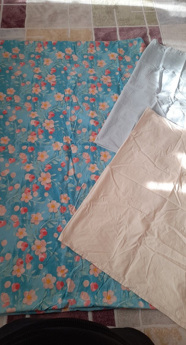 Pastel renklerde çiçek desenli nevresim ve yanında bej ile açık gri düz çarşaflar bulunur. çarşaf iki adet yastık kılıfı yok