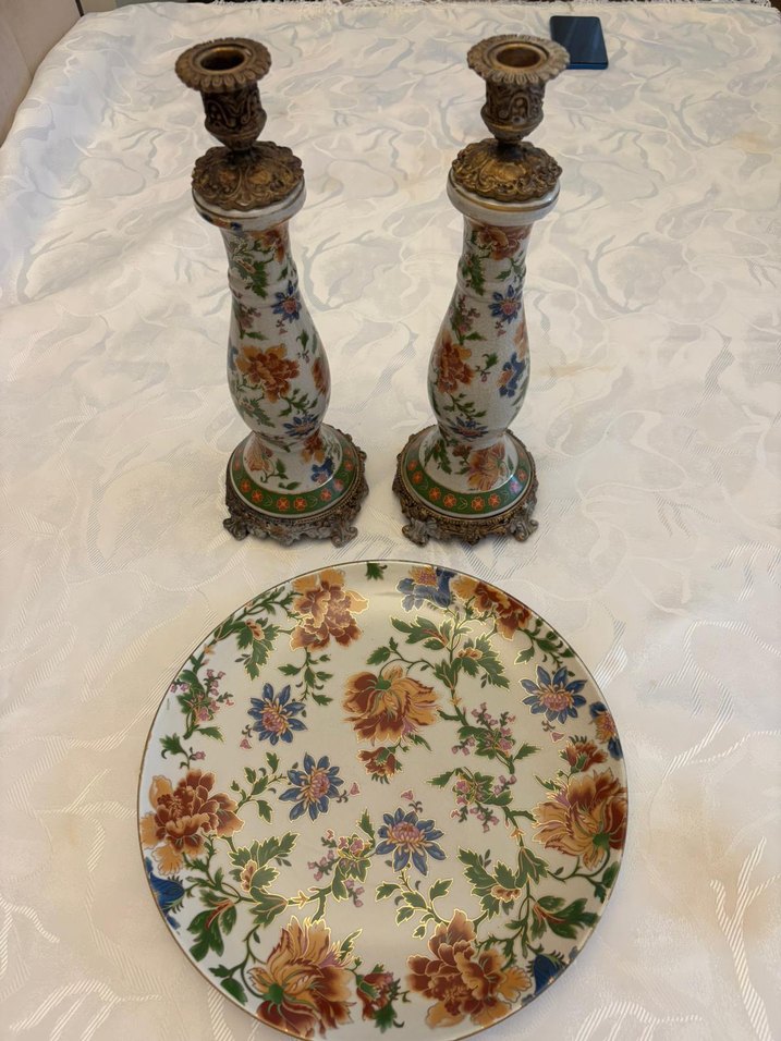 Çiçek desenli çok renkli şamdanlar ve uyumlu tabaktan oluşan set. Şamdanların taban ve üst kısmı süslü detaylara sahip. ️