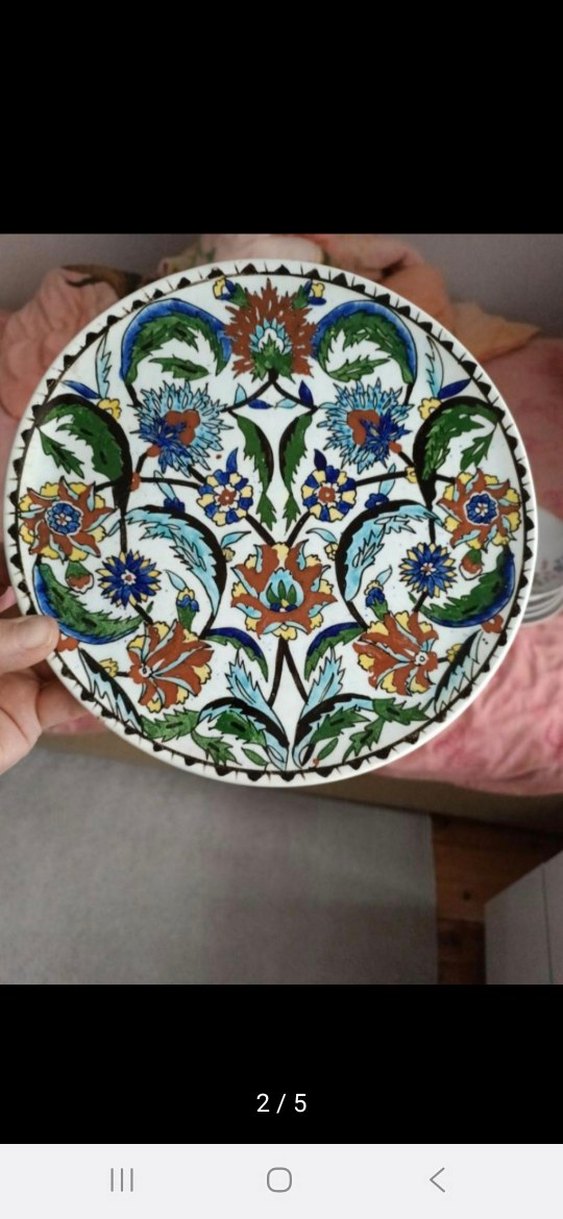 Çiçek desenli, koyu çok renkli geleneksel tarzda yuvarlak tabak.