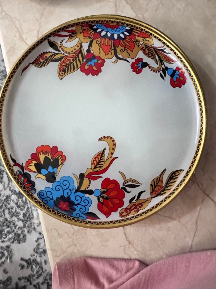 Çiçek desenli, koyu renk tonlarında çok renkli klasik tarzda tabak. Altın renkli kenar detayı ve parlak yüzeye sahiptir. ️6 servıs tabagı