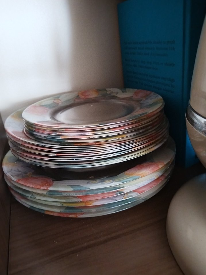 Çiçek desenli, çok renkli ve açık tonlarda birden fazla tabak içeren servis seti. Tabaklar yumuşak ve canlı renklerde çiçek motiflerine sahiptir. 6 kişilik 30 parca arcopal 30 yıllık vitrinde bekledi sıfır ürün