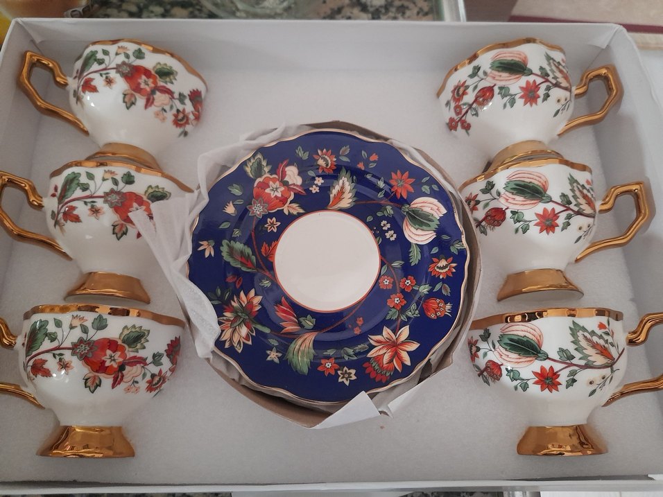 Koyu mavi taban üzerinde canlı çiçek desenleri bulunan çok renkli tabak seti, sofranıza şık bir dokunuş katar.