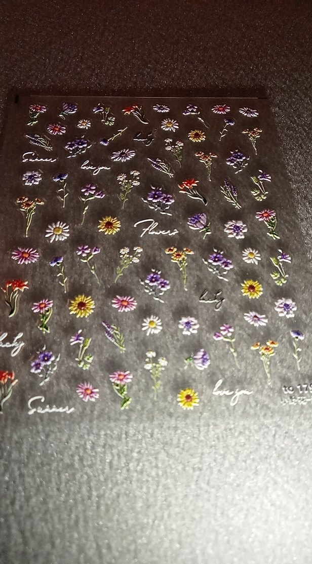 Çiçek desenli, koyu ve çok renkli tırnak süsleri içeren set, detaylı tırnak tasarımları için uygundur.