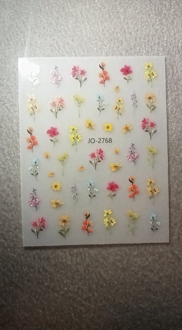 Çok renkli, küçük çiçek desenli tırnak süsleri içeren bir yaprak. Tırnaklara hafif ve renkli bir dokunuş sağlar.