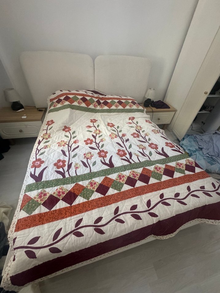 Koyu renkli, çok renkli çiçek desenli, kapitone detaylı ve dekoratif bordürlü yatak örtüsü, odanıza sıcak ve şık bir hava katar. hiç kullanılmadı. misafir yatak örtüsü olarak alınmıştı. yıkandı. #örtü #yatak #pike #yatak #çeyiz #englishhome #zarahome #lcwhome #madamecoco