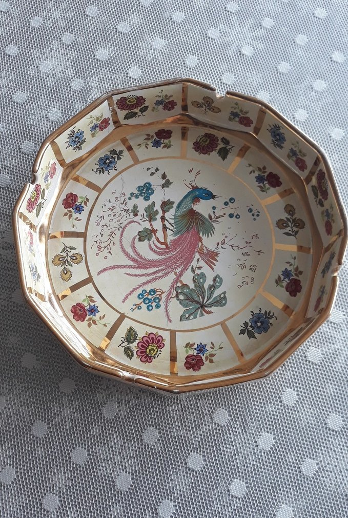 Çokgen şekilli, açık renkli porselen tabakta kuş ve çiçek desenleri yer alıyor. Kenarları altın detaylarla süslenmiş. ️