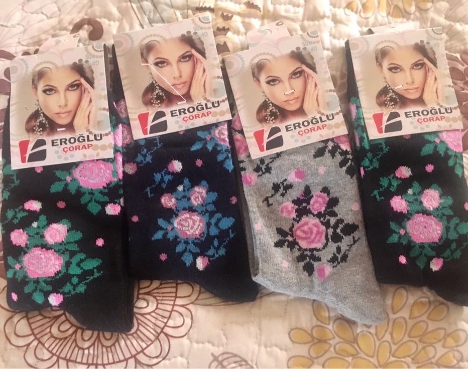 4’lü çiçek desenli, yumuşak dokulu tekstil çoraplar. Koyu çok renkli ve Eroğlu markalıdır.
