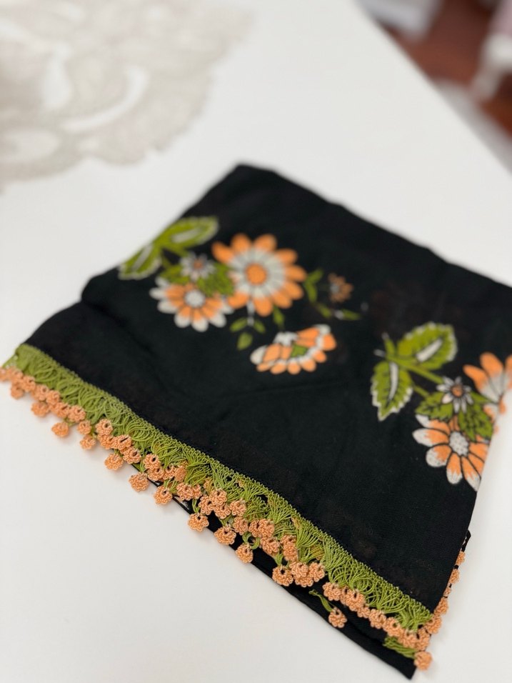 Koyu renkli çok renkli çiçek desenli, dantel detaylı bohem kadın şalı, retro ve hippie tarzına uygun.