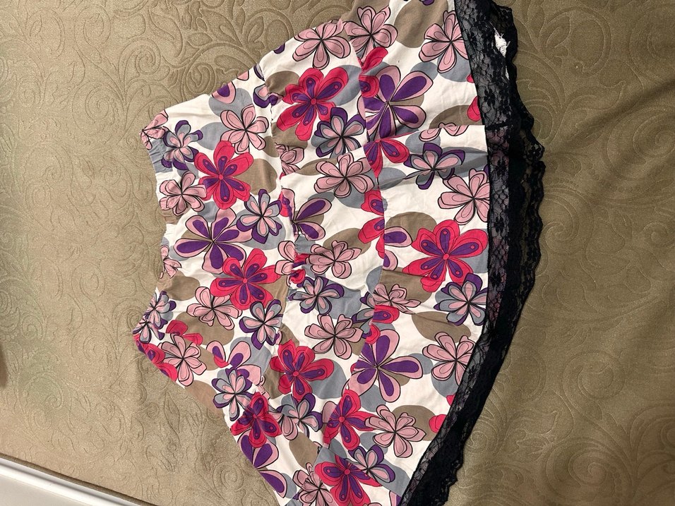 Çiçek desenli, dantel detaylı ve bol kesim eteği, bohem tarzda parti için uygundur. Sarı bi leke var yıkanırsa geçer gibi 3-4 kez giyildi. Beden yazmıyor fakat 55-70 kg iken giyilir.