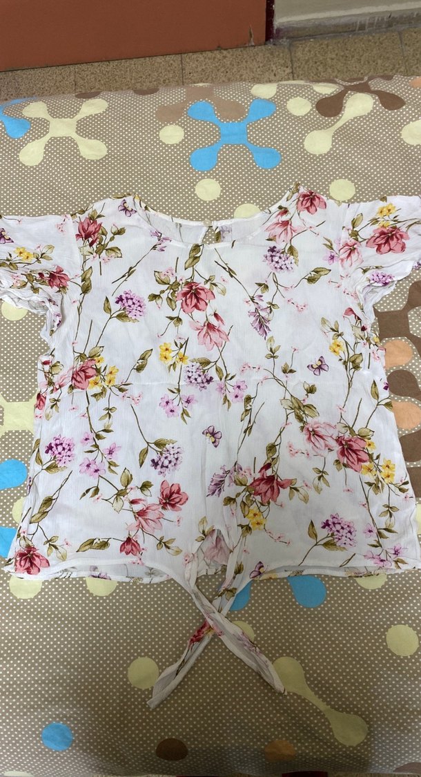 V yaka ve kısa kollu, dantel detaylı, çiçek desenli, rahat kesim hamile bluzu. Yumuşak sentetik kumaştan, günlük kullanıma uygun.