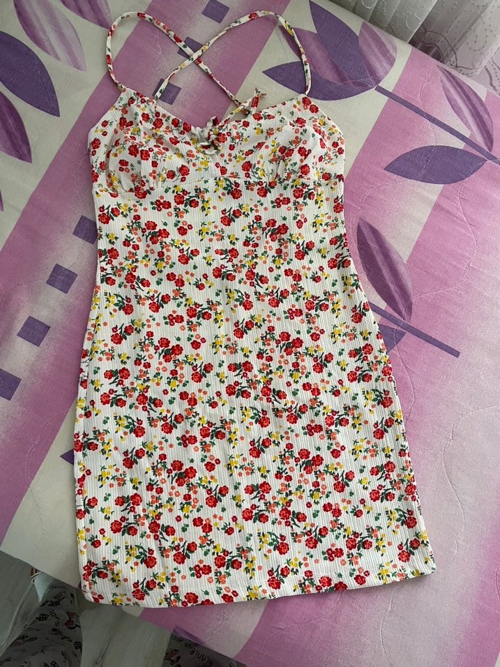 Çiçek desenli, dantel detaylı, askısız ve sırtı çapraz bantlı, midi boy, dar kesim elbisedir. Bohem ve vintage tarzda günlük sokak giyimine uygundur.