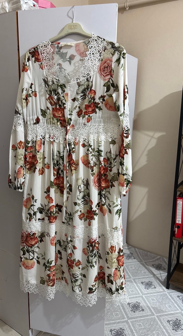Uzun, beyaz pamuklu elbise, gevşek kesim, çiçek desenli ve dantel detaylıdır. Uzun kollu ve V yaka, bohem tarzını yansıtır.