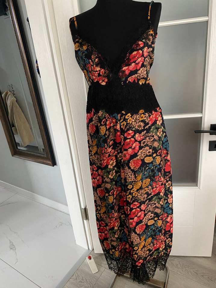 Dantel detaylı, çiçek desenli, straplez ve ince askılı uzun bohem tulum,romantik akşamlar için uygun.# bel 83 cm boyu 1.20 cm, askılı olarak 1.30 cm# yeni ürün# çok şık# tulum#zara#