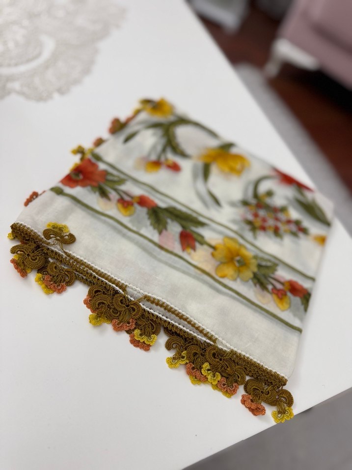 Çiçek desenli, dantel kenarlı ve çok renkli hafif tonlarda bohem tarzı kadın fularıdır. Yumuşak ve dekoratif bir aksesuardır.