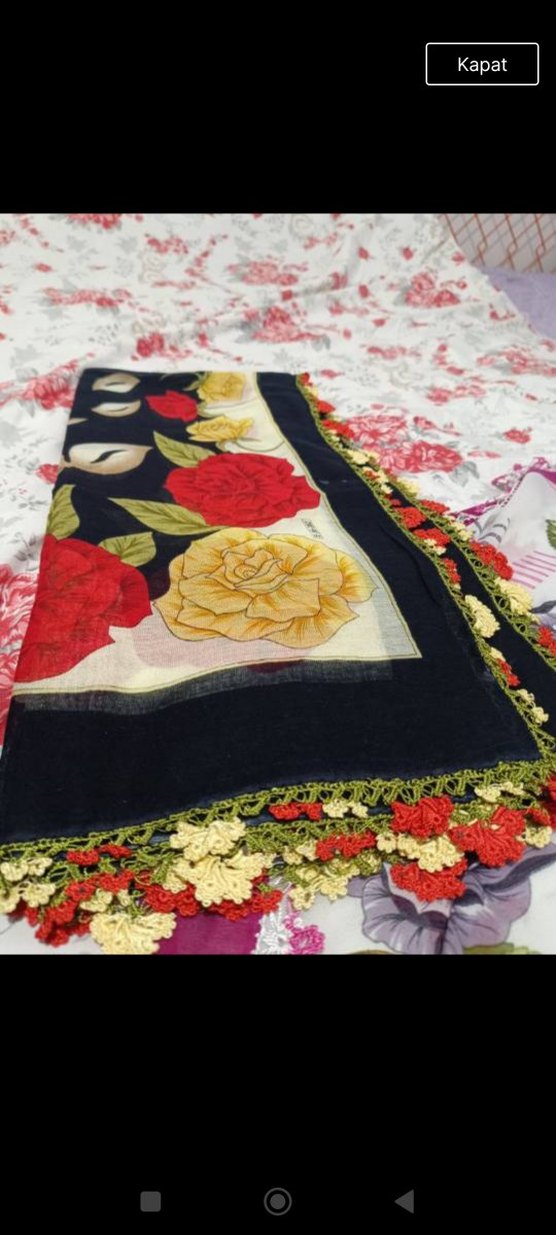 Kadın fular, koyu ve canlı renklerde çiçek desenli, dantel kenarlı, bohem ve retro tarzı yansıtır.