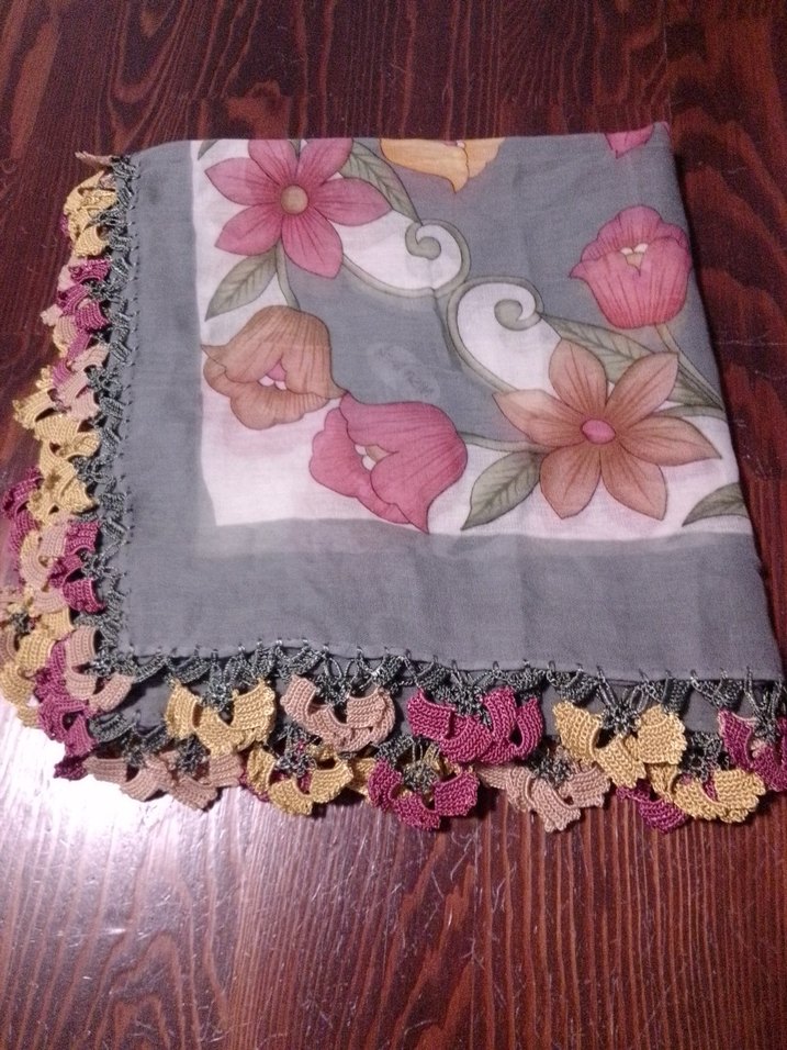 Gri zemin üzerine canlı çiçek desenleri ve pembe, sarı, mor tonlarında zarif dantel kenar süslemeleri bulunan bohem tarzda kadın fuları. tığ oyası oyası tülbent, yemeni , fular ,mevlid örtüsü, dört tarafı çevrilidir 90*90 ebatlarındadır. Sıfır üründür. Telefon eski olduğu için renkleri tam çıkmıyor daha canlı renklerdir. #aksesuar #şal #atkı #tasarım #çeyiz #bohça #düğün #günlük #koton #örgü #bershka #zara #bolero #pareo #fular #bandana #yazma #yemeni #oya #boncuk #elişi #örtü #eşarp #mevlidörtüsü #tülbent #firkete #iğneoyası #mekikoyası #boncukoyası #kumboncuk #tığoyası
