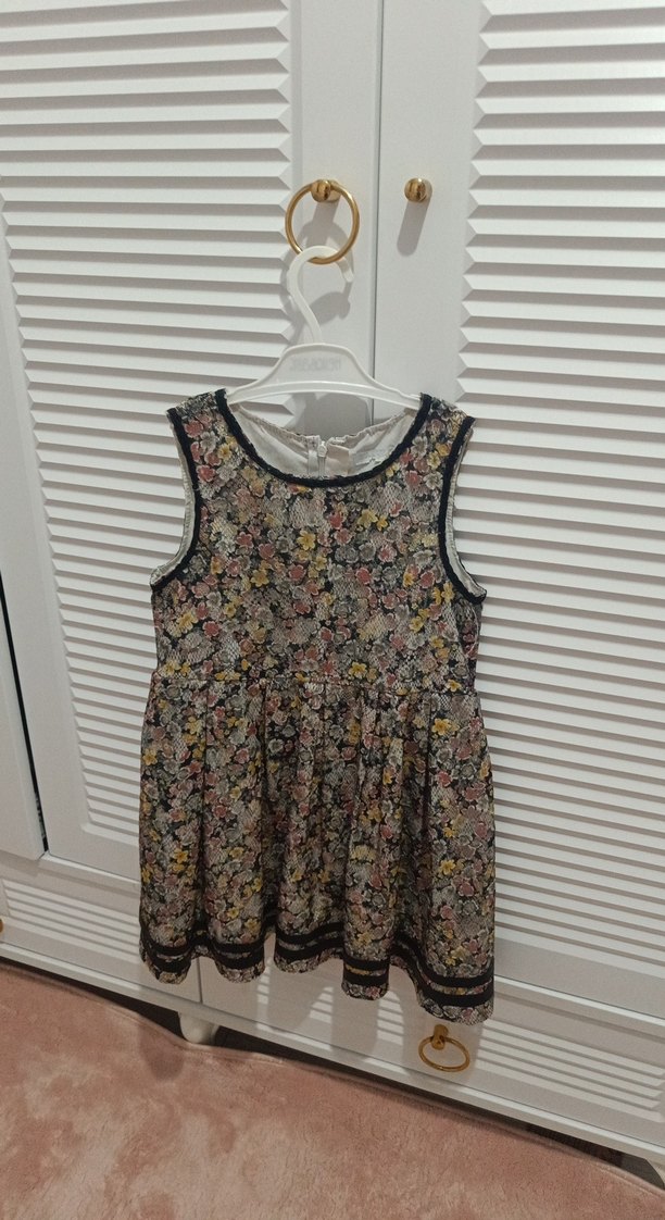 Dantel detaylı, askısız yaka ve bol kesim kız elbisesi. Çok renkli çiçek desenli ve gri tonlarında, bohem tarzında.