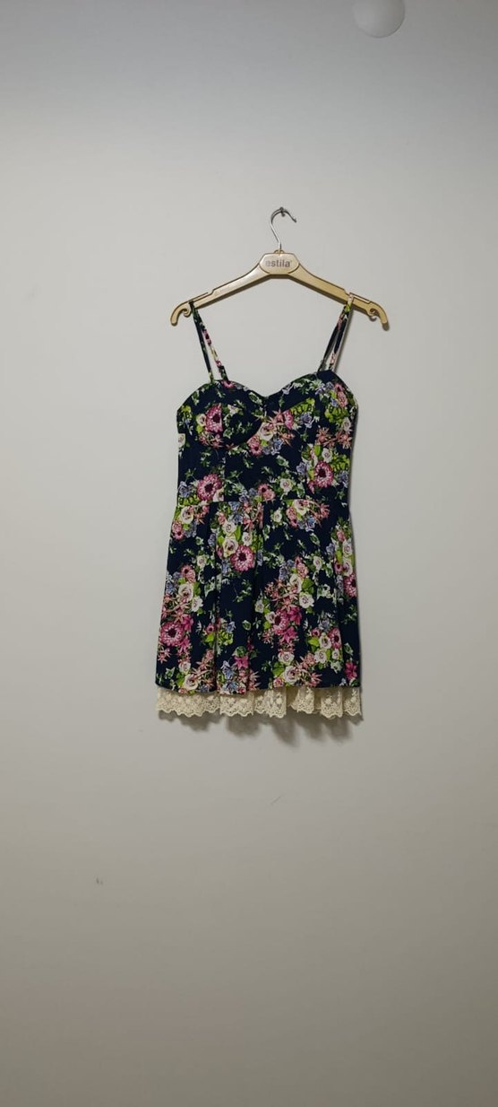 Bohem tarzda, çiçek desenli mini elbise, dantel detaylı. İnce askılı, straplez yaka ve rahat bol kesim. Koyu renkli çok renkli kumaş kullanılmış. Yumuşacık bir kumaşı var.