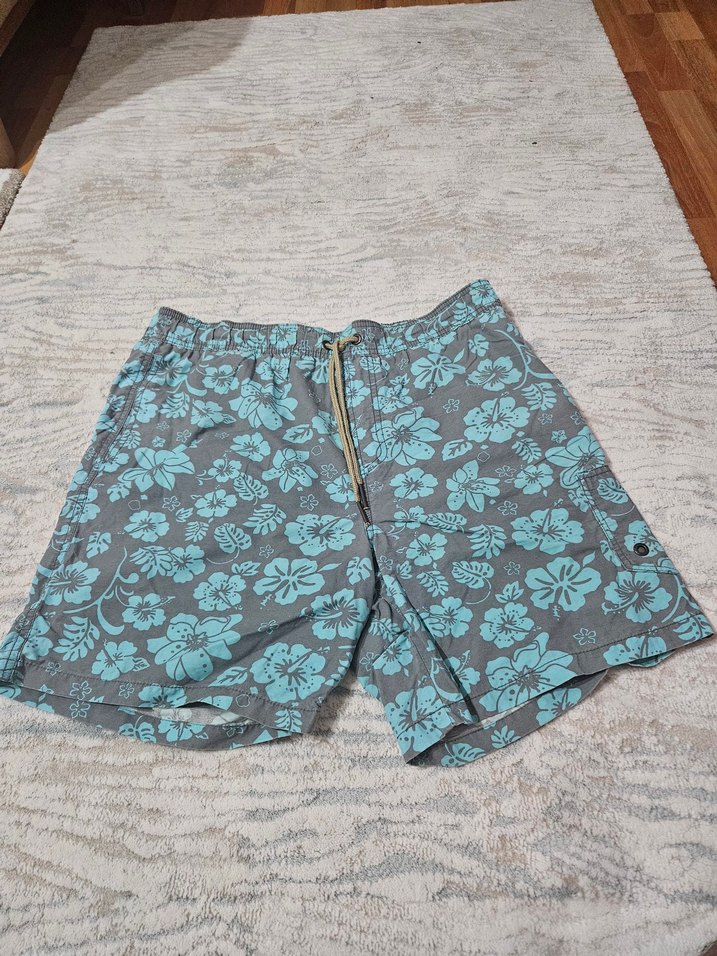 Gri taban üzerine mavi çiçek desenli, bol kesim erkek mini mayo. plaj ve sokak stiline uygundur. Next L