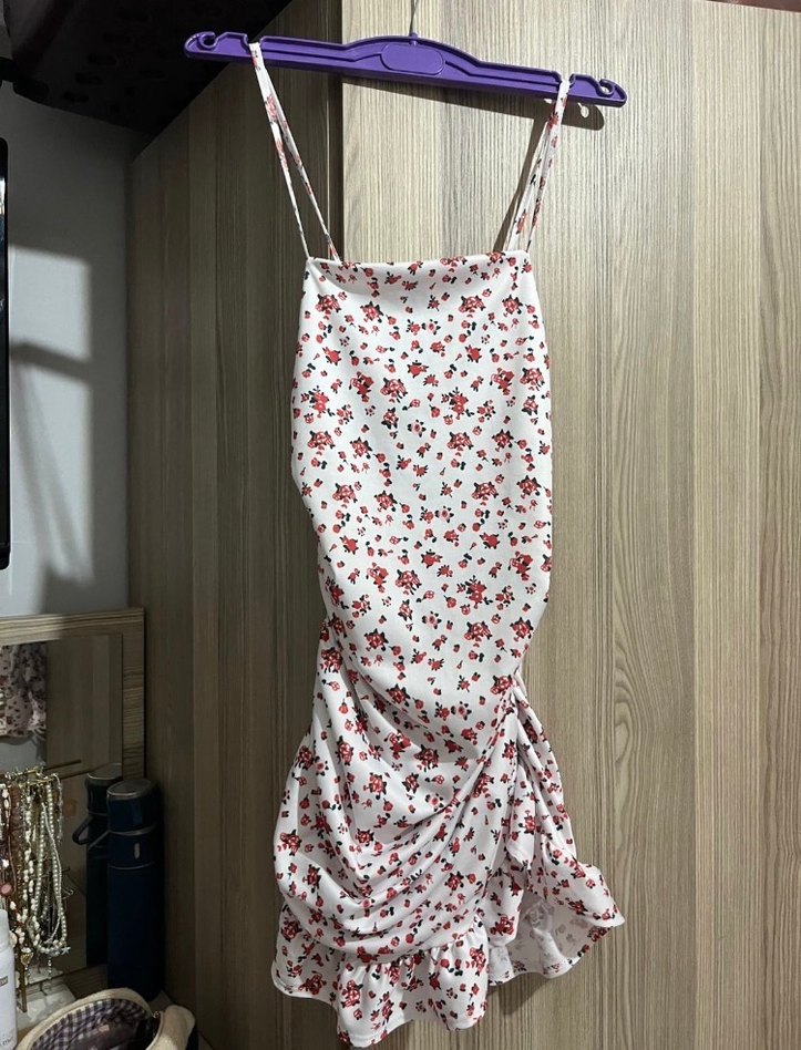 Çiçek Desenli Drapeli Beyaz Midi Elbise