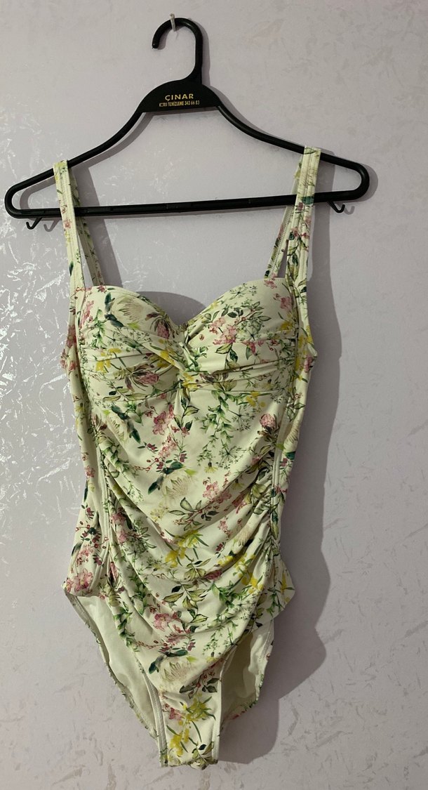 Drapeli, çiçek desenli ve ince askılı bu mayo, bohem ve vintage tarzıyla plaj için uygundur.