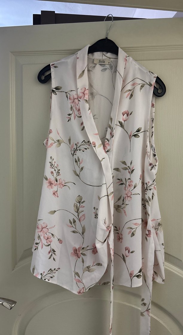 Askısız, bol kesim hamile bluzu, drapeli tasarıma sahip. Straplez yakası ve pastel çiçek desenleriyle ofis için rahat ve şık bir seçenek.