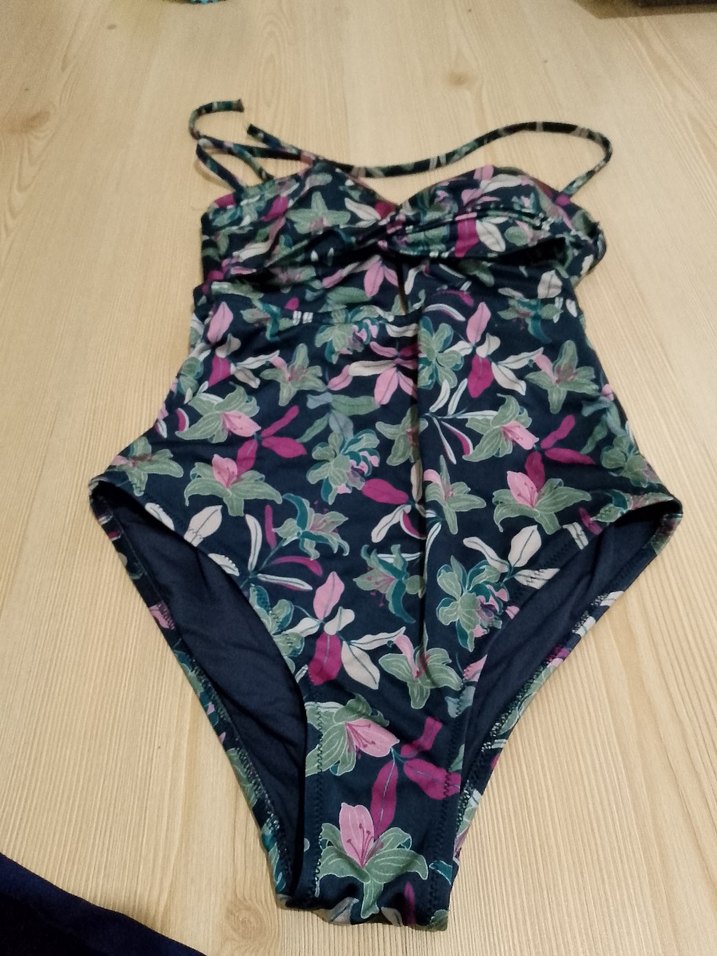 Çiçek desenli, drapeli ve ince askılı bu kadın mayosu, koyu ve çok renkli tasarımıyla dikkat çeker. Bohem athleisure tarzında, plaj için uygundur.