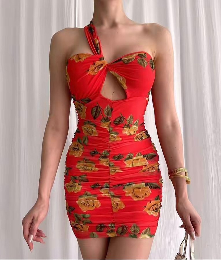 Kırmızı, çiçek desenli, drapeli ve straplez yaka detaylı, vücuda oturan mini elbise, yumuşak sentetik kumaştan üretilmiştir.