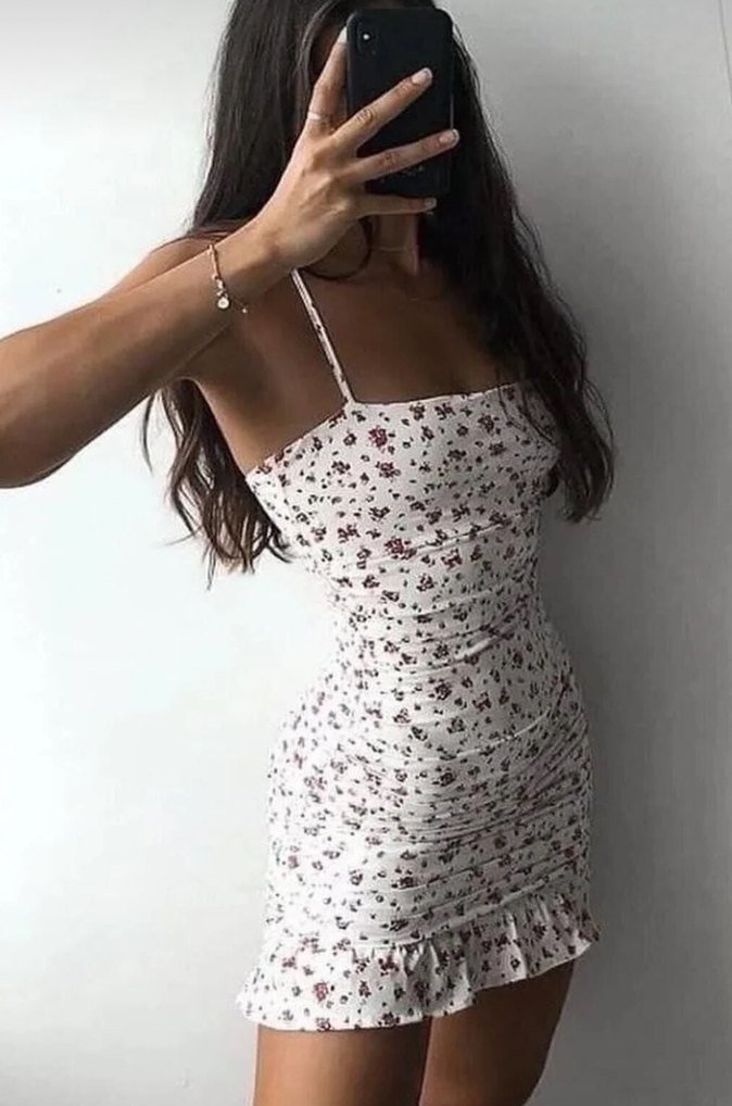 Beyaz çiçek desenli, askılı ve drapeli, bohem tarzda, vücuda oturan midi uzunlukta mini elbise.