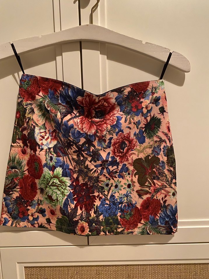 Drapeli tasarıma sahip, çiçek desenli ve fitted kesim mini etek. Romantik gece için bohem tarzda, koyu ve çok renkli.