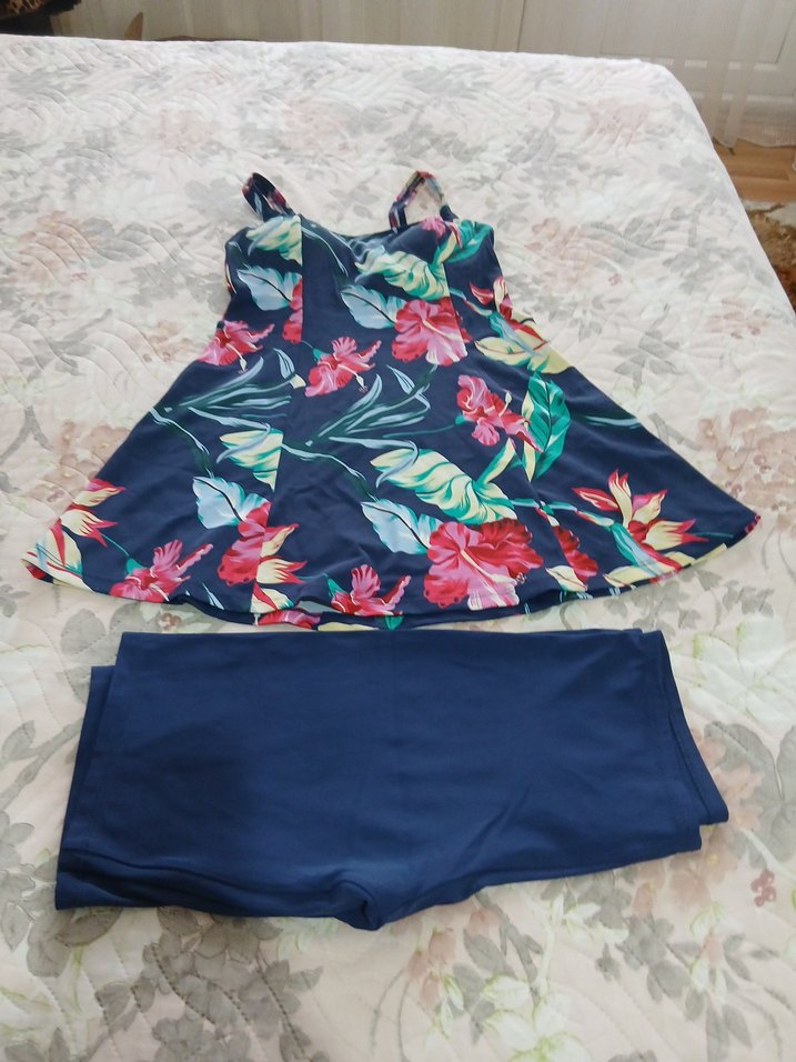 Mavi zemin üzerine renkli çiçek desenli, drapeli ve fitted mini üst ile düz mavi şortlardan oluşan kolsuz kadın mayo. Günlük kullanıma uygun athleisure tarzında.