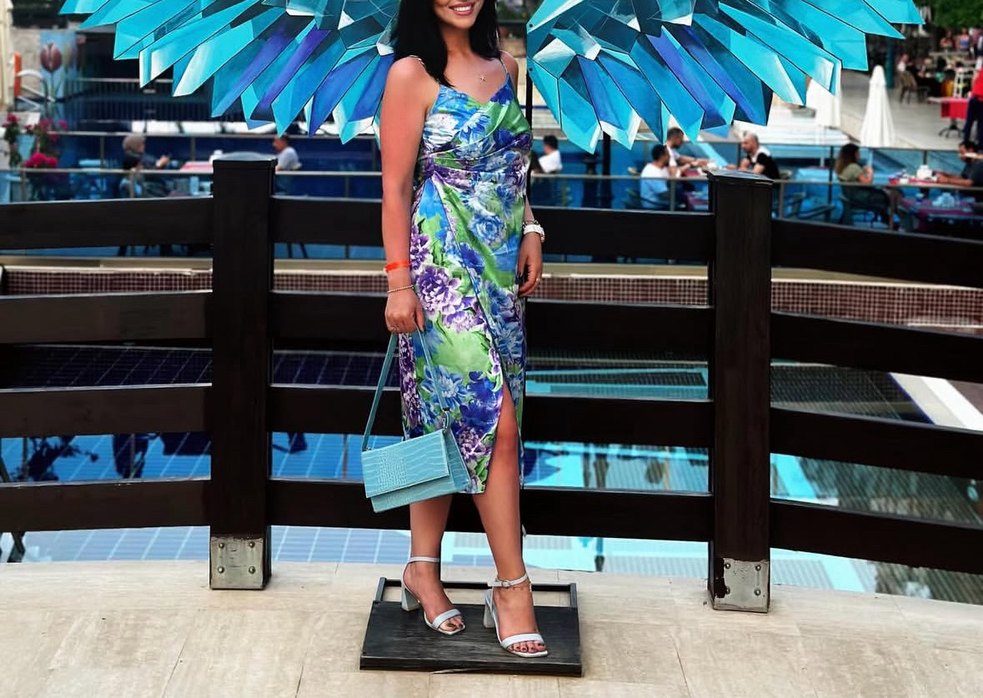 Bu dar kesim, askısız kalem elbise, canlı çiçek desenli drapeli tasarıma sahiptir. Hafif renklerde sentetik kumaştan üretilmiştir, parti için uygundur.