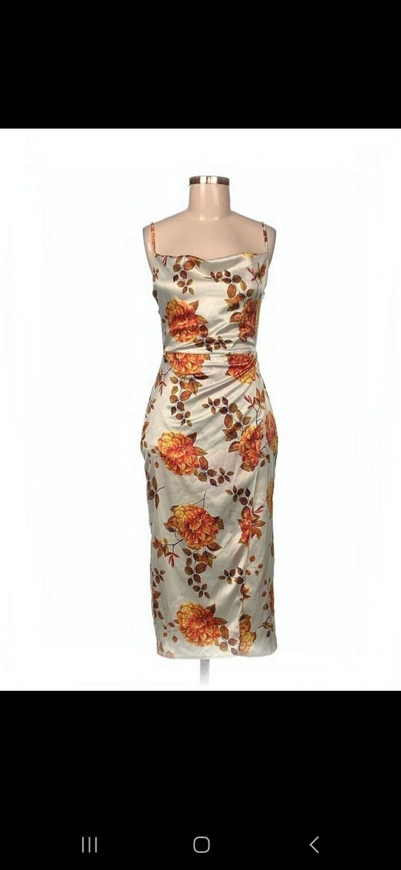 Bej zemin üzerine canlı çiçek desenli, drapeli yakaya sahip, kolsuz ve uzun kalem kesim elbise. İnce ve şık, romantik buluşmalar için ideal.