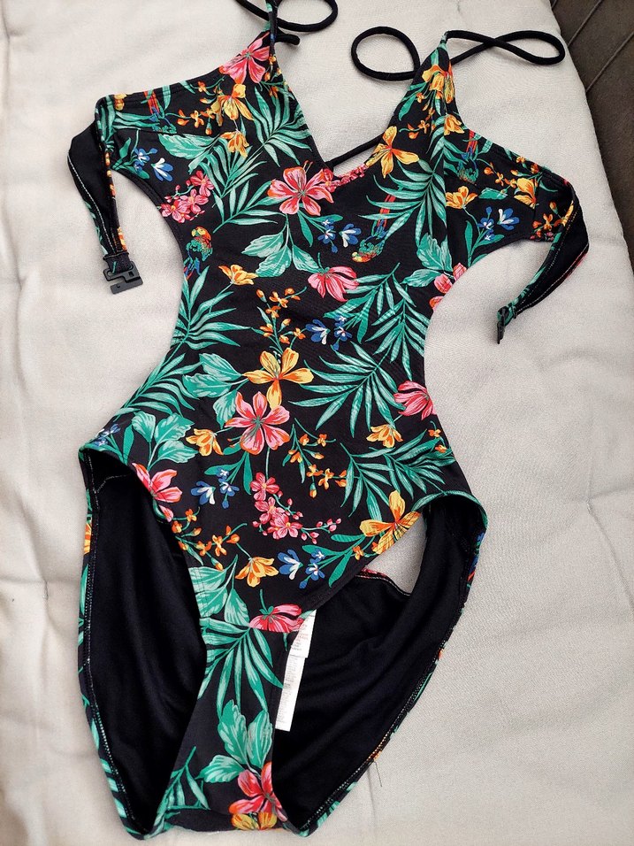 Çiçek desenli, drapeli ve ince askılı, vücuda oturan uzun mayo, plajda kullanıma uygundur.