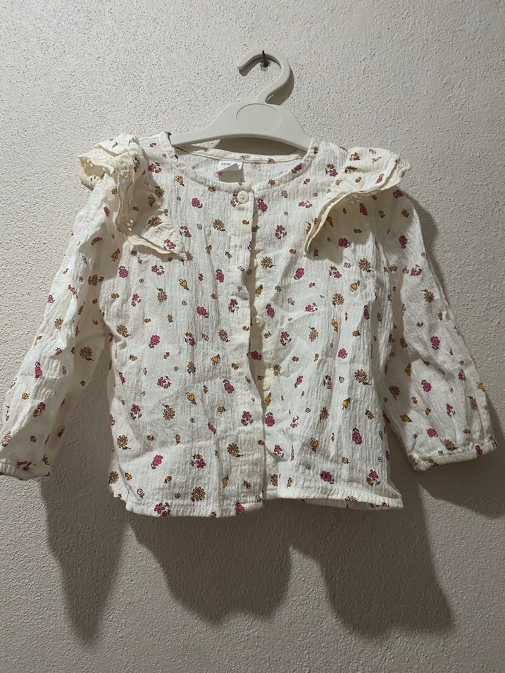 Pamuklu, uzun kollu, düğmeli beyaz kız gömleği. Yakalı, bol kesim ve çiçek desenlidir. Bohem tarzda rahat bir tasarım.