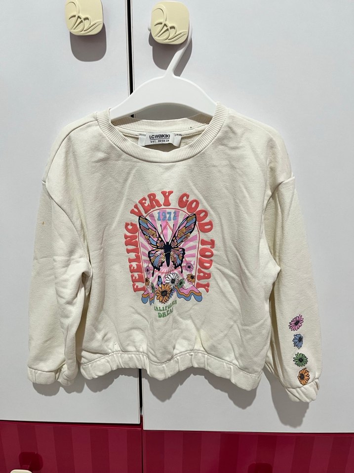 Rahat kesim, uzun kollu beyaz sweatshirt. Kolunda renkli çiçek baskıları ve düğme detayları bulunur. Yumuşak ve sıcak kumaştan üretilmiştir. Kolunda küçük leke var resimde var 3-4 yaş