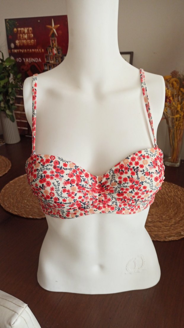 Renkli çiçek desenli, düğmeli, ince askılı bohem tarzda, günlük kullanıma uygun bikini üstü. 36 beden sıfır ürün.sungerli kaskli.