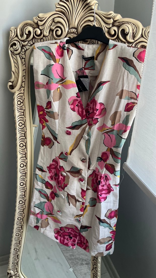 Düğmeli ve V yakalı, çiçek desenli, hafif pembe renkli, keten kumaş 36 beden hiç kullanılmadı