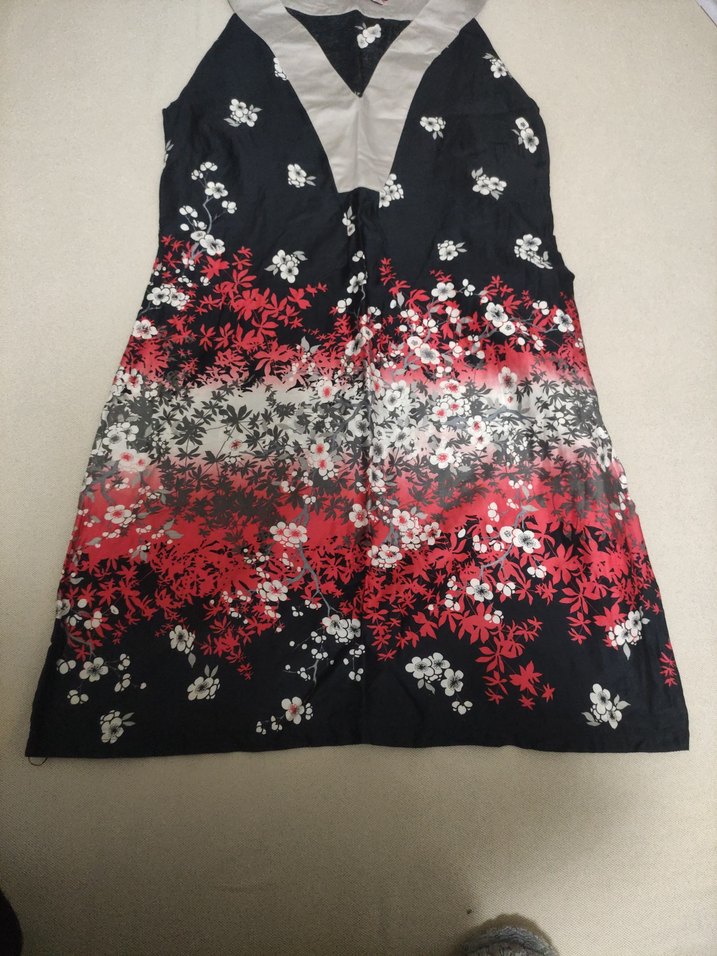 V yaka, düğmeli, çiçek desenli, kolsuz bohem tarzı uzun elbise. Rahat ve bol kesim, günlük kullanıma uygun.