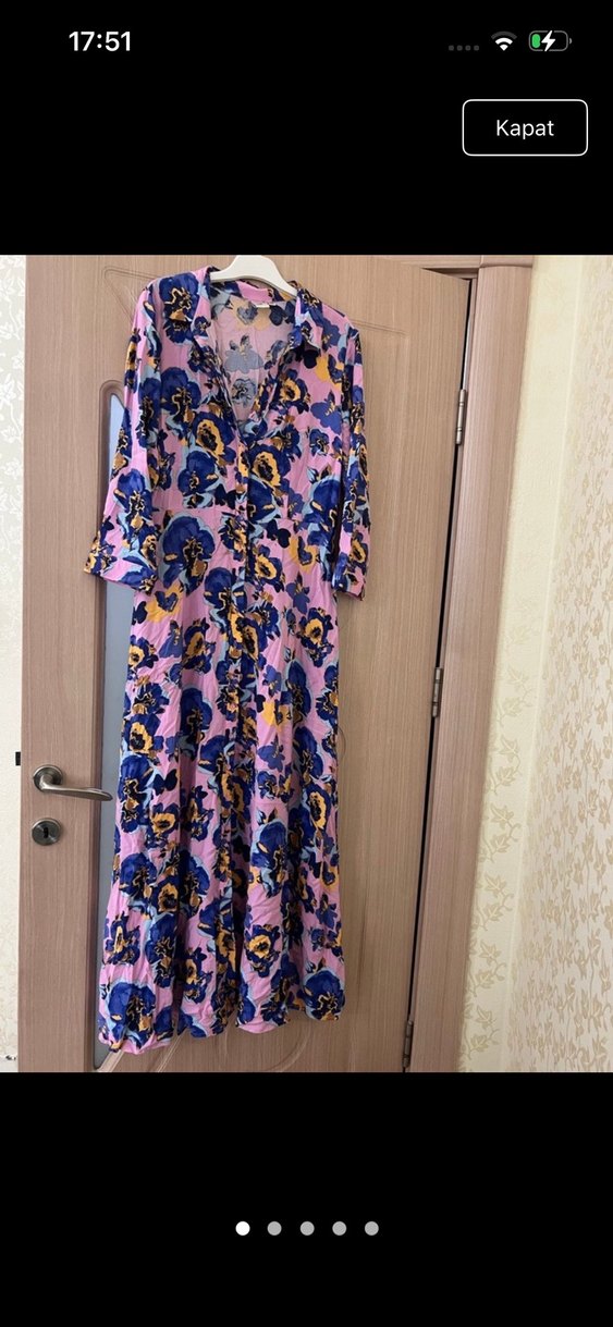 Pastel tonlarda çiçek desenli, uzun ve bol kesim bohem elbise. Uzun kollu, V yaka ve düğmeli detaylara sahip, yumuşak sentetik kumaştan yapılmıştır.